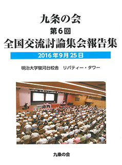9条の会第6回全国交流討論集会 報告集 @九条の会は9月25日、第6回全国交流討論集会を開催しました。この集会は東京・明治大学駿河台キャンパスを会場に全国400の地域・職場・分野の九条の会から500人が参加して行われました。全体会では、九条の会に12人からなる「世話人会」の設置が発表されました。午後の分散会では活発な意見交換がおこなわれました。 Aこの集会の報告集が発売されました。頒価800円です。憲法会議でも扱っています。九条の会の取り扱い基準(5部以上9掛、送料注文者負担)に準じて取り扱います。 目次は下の画像をクリックしてご覧ください