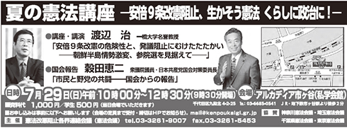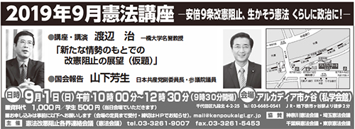 中央と首都圏の憲法会議は10月3日、憲法講座を専修大学で開き515名が参加。下のボタンをクリックするとPDFファイルで「憲法講座」のご案内ビラを閲覧できます。