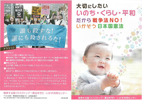 ◆憲法パンフレット大好評、1/23に150,000冊突破! 「パンフで憲法カフェを開催したい」「村の1軒1軒に配り、3000万人署名をお願いする」等と注文が続いています。このパンフをさらに広めにひろめ、9条改憲を阻止しましょう。皆さまのご協力をお願いします。 ◆「改憲4項目の条文素案と危険性」を追加資料として差し込んで普及します。ご協力ください(2018年4月19日、画像を更新)
